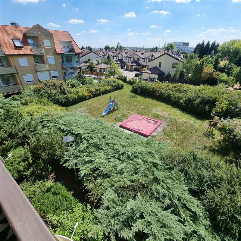Pod budynkiem dużo terenów zielonych oraz plac zabaw.