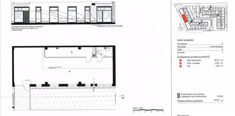 Lokal użytkowy (usługowo-handlowy), o pow. ~104m2 znajduje się na parterze w budynku IV piętrowym.